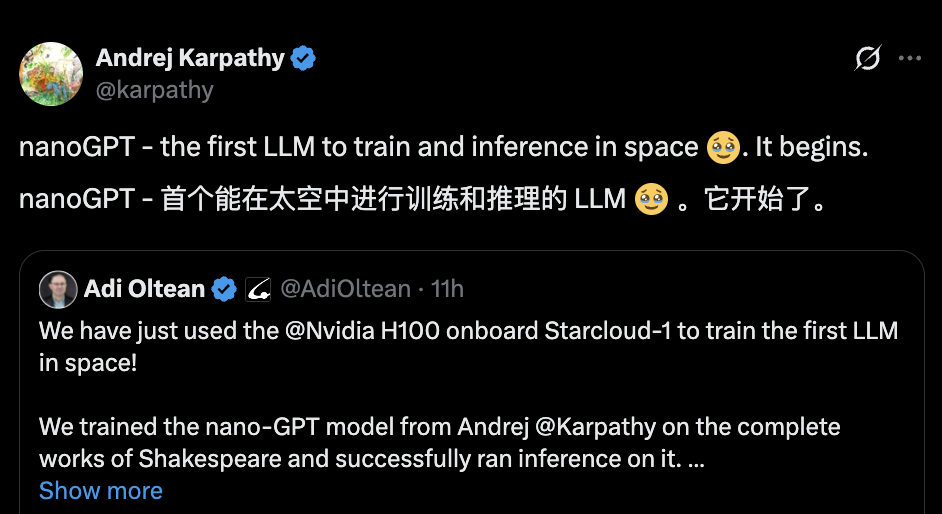 而首个直接在太空中进行训练的则是Andrej karpathy一手打造的LLM——NanoGPT。