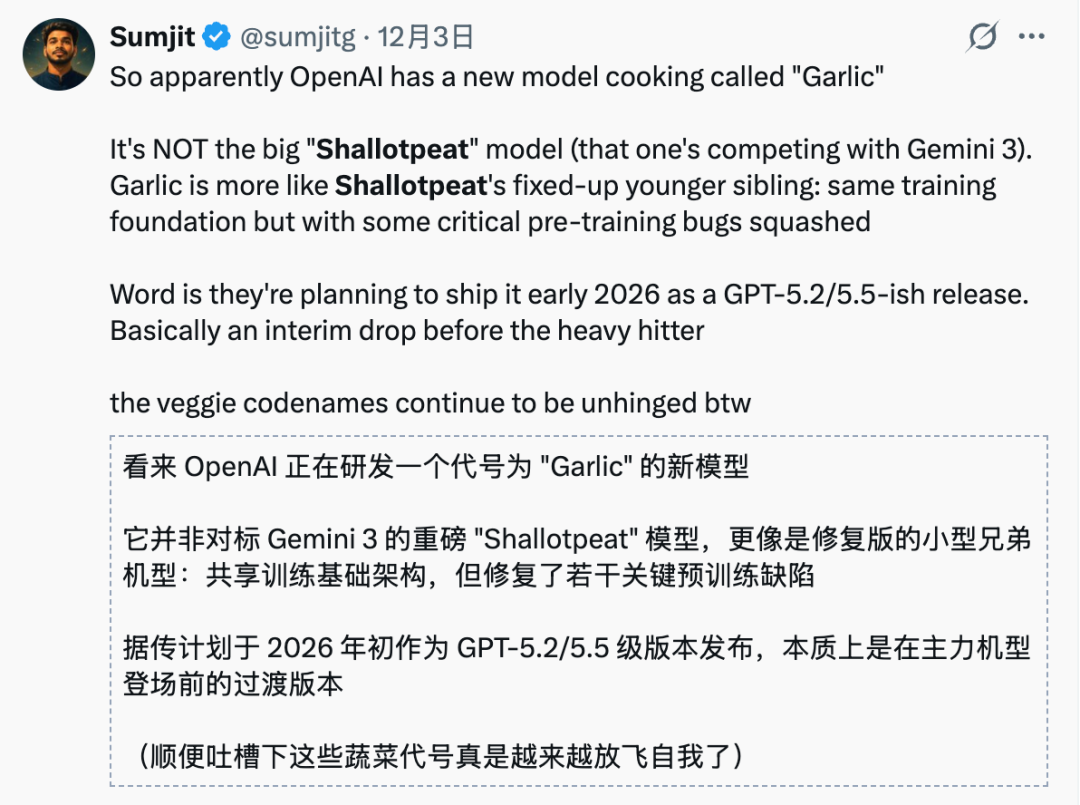 Garlic是内部代号,未来很大概率会以GPT-5.2或GPT-5.5的商业名称对外发布,但现在还没有最终定案。