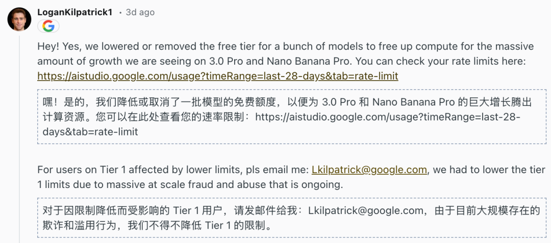 是的,我们降低或取消了一批模型的免费层级,目的是释放算力,以应对3.0 Pro和Nano Banana Pro所面临的巨大增长需求。