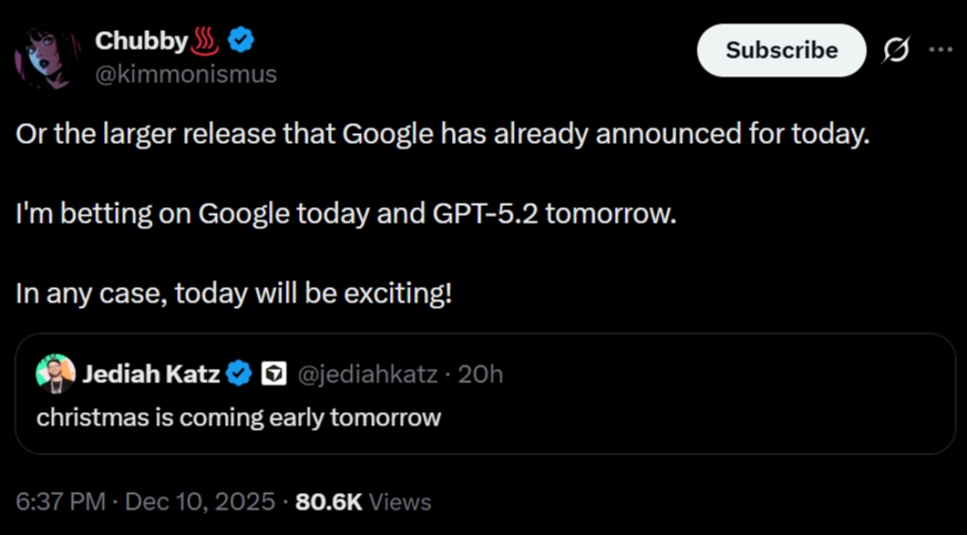 GPT-5.2和Gemini 3 Flash迎头对打;另一边,NanoBananaPro风光无限,Sora则很可能被暂时搁置。