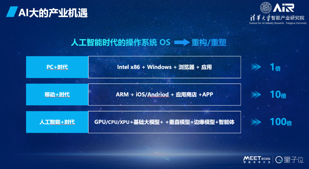 就像在PC时代我们有Windows,在移动时代有安卓和iOS,同样在人工智能时代操作系统就是一个基础大模型。有了这个操作系统之后,它下面的芯片架构、上面的应用生态都会完全被重构。