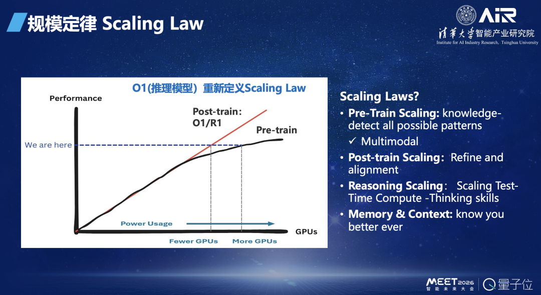 第二个趋势很重要,就是规模定律在预训练阶段已经放缓了,尽管这个智能还在往前走,更多的智能放到后训练、推理、智能体阶段。
