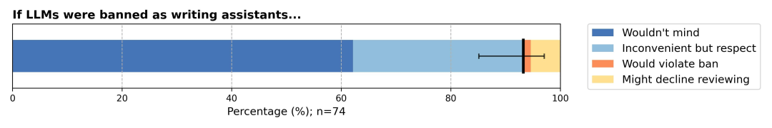 从上图的调查结果得知,如果ICML强行搞「一刀切」禁止LLM,虽然大部分人会遵守(深蓝),但会给一部分人带来工作负担(浅蓝),甚至逼迫极少数人走向「学术不端」(橙色)。