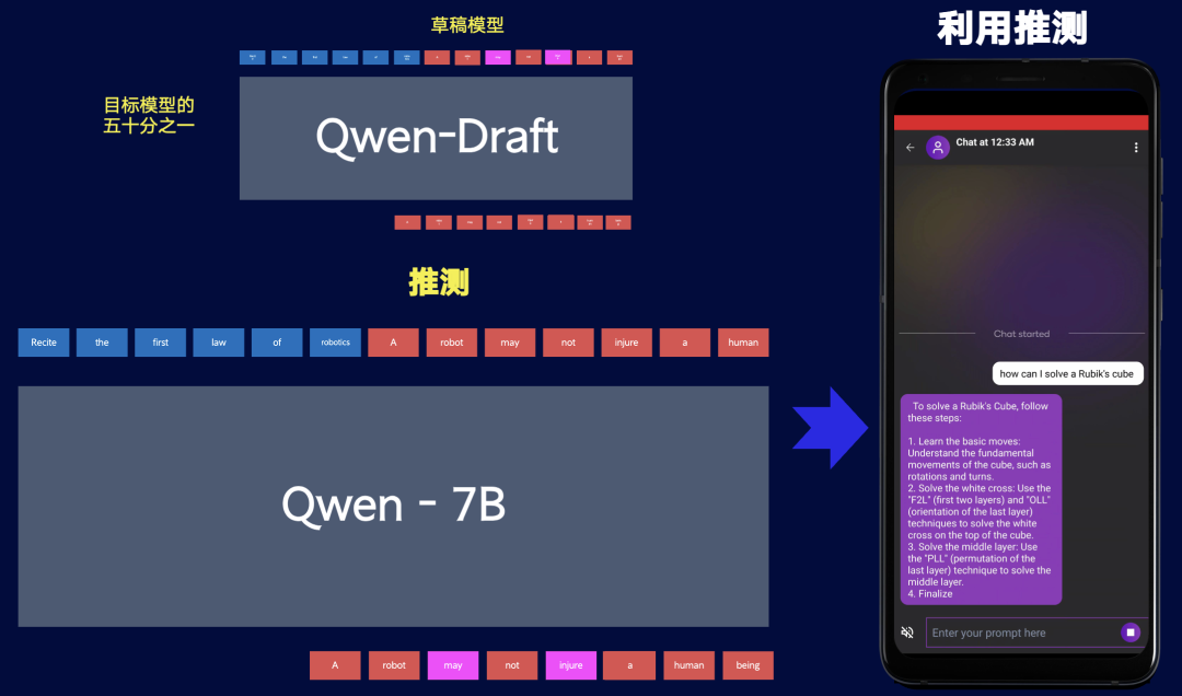 高通通过并行解码技术,先在端侧运行一个较小的草稿模型,一次性推理出多个token,然后将这些token交予原始的、较大的模型进行校验。