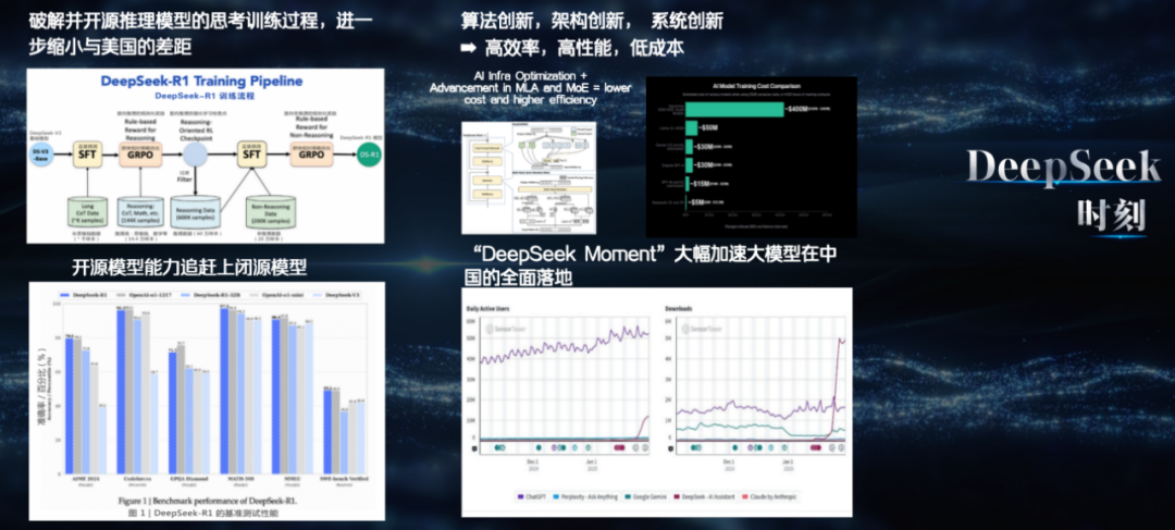 另外一个重要的里程碑,来自中国的DeepSeek。这个也是出现在一个寒冷的冬天,就是今年的1月份。DeepSeek出现之前,中国有上百个大模型,这些大模型基本上都在学习 OpenAI,学习ChatGPT,整个技术路径、算法的架构体系,基本上都是在模仿学习。