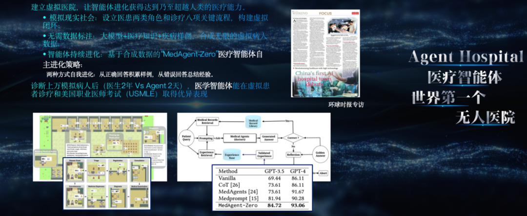 人工智能在医疗领域的另一突破,是AIR刘洋老师团队打造的全球首个无人智能体医院——清华大学人工智能医院(今年4月成立)。这是一个虚拟医院,医生、病人、护士等角色均由智能体担任,涵盖不同科室,形成完整诊疗闭环。智能体之间通过协作、博弈不断进化,无需人工标注数据,仅需两天时间就能完成相当于两年的病例诊断学习,诊断准确率超过传统医院。