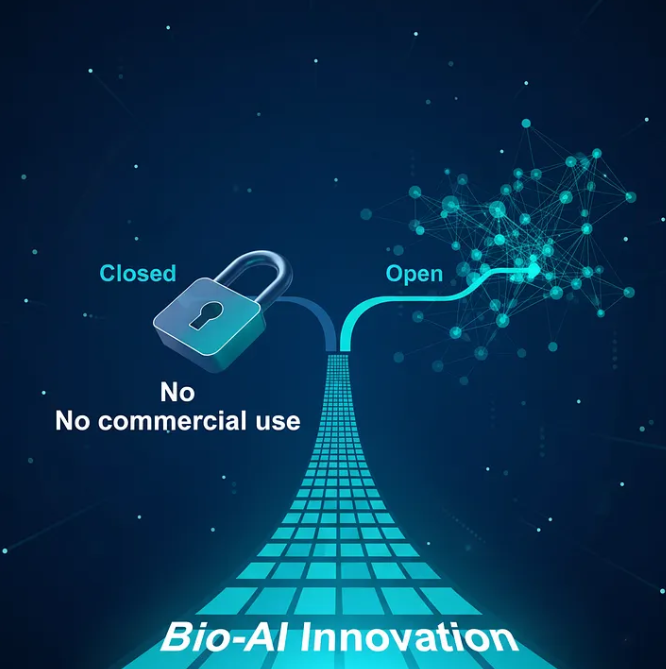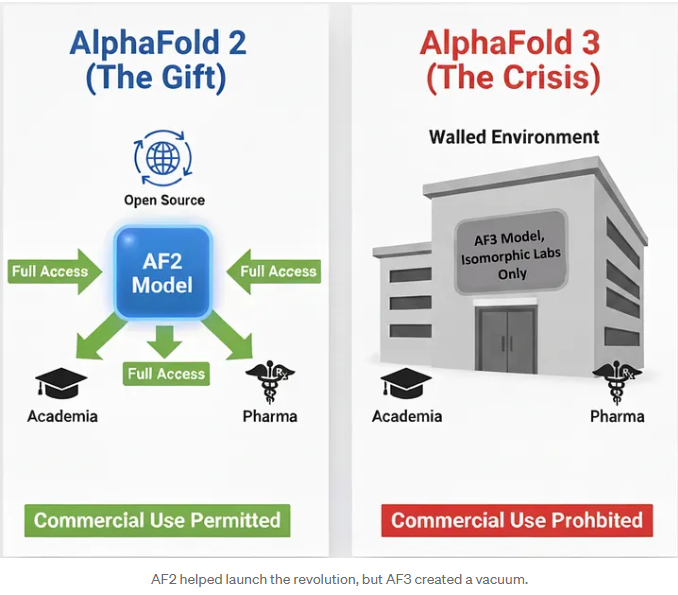 随着 Google 在 2021 年成立 Isomorphic Labs 商业化 AlphaFold 系列产品,AF3 在 2024 年发布时采用了“禁止所有商业使用”的许可证。换句话说,行业无法合法将其用于药物研发——这个模型本来正是为此而生的。