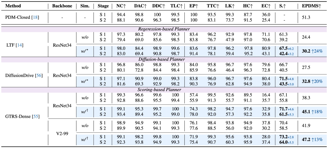 SimScale的协同训练策略可适用于各类端到端规划模型,包括回归型(regression-based)、扩散型(diffusion-based)及轨迹评分型(scoring-based)规划器。