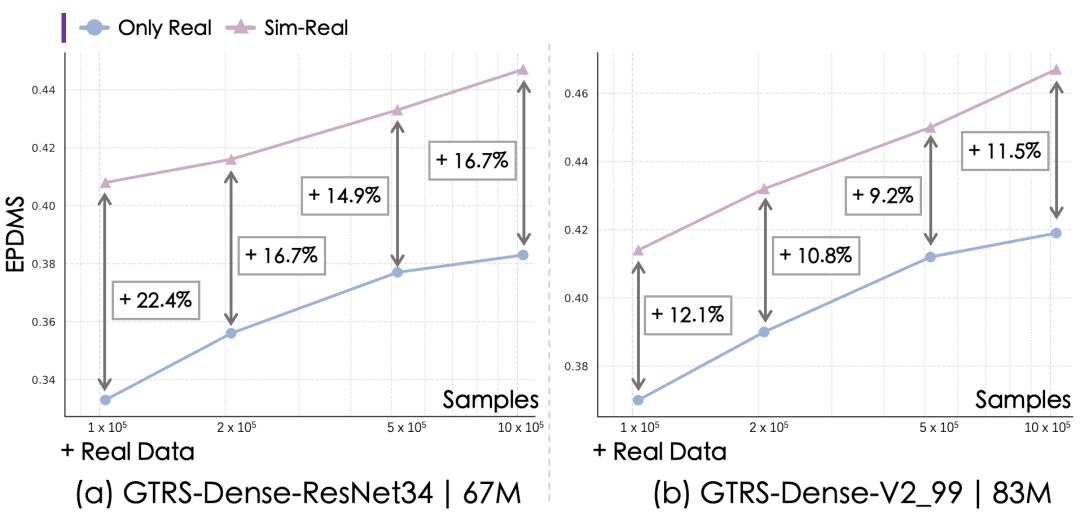 这表明SimScale能在不同数据规模下持续放大端到端系统的性能。