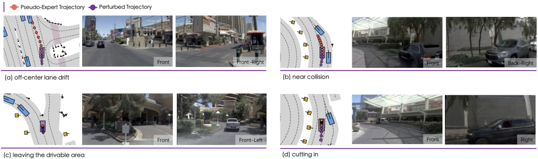 实际应用中,仿真中生成四类真实驾驶中最易触发模型失效的关键场景,包括偏离车道、近距离失碰、车道脱出与加塞切入,并为每个场景提供伪专家轨迹与扰动历史动作,帮助策略在高风险、短时决策条件下学习更强的纠偏与避险能力。