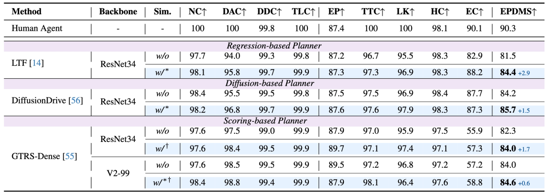 而在navtest基准中,所有类型的端到端规划器的性能也有明显增强,最多可提升2.9 EPDMS。