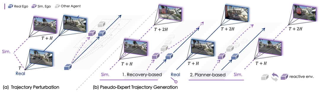 基于恢复的策略(Recovery-based):以安全与稳定为优先目标,偏保守。该策略根据车辆的失稳状态快速生成一条可控、平顺、能将车辆拉回人类轨迹的恢复路径,为模型提供可靠的“安全底线”示范; 基于规划的策略(Planner-based):依托具有特权信息的规划器,它会选择更灵活、探索性更强的行为,如提前变道或主动避让,使模型能够学习更高价值、更接近真实驾驶决策的复杂规划模式。
