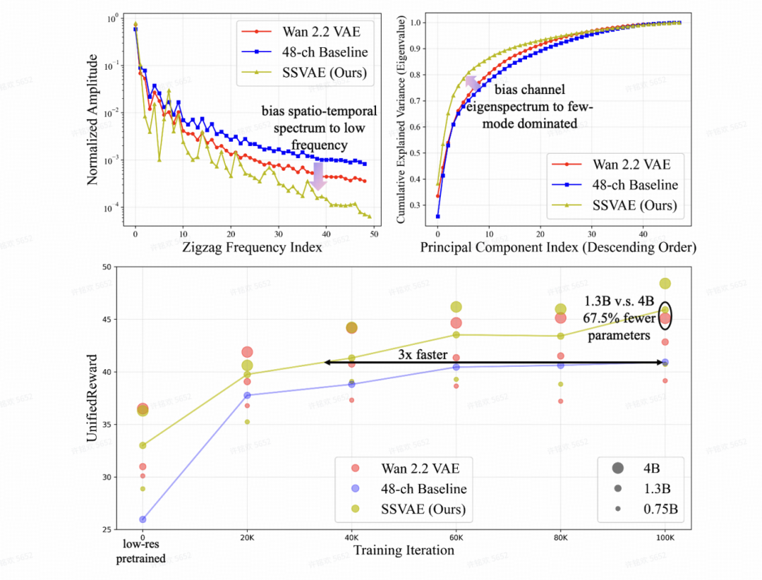 SSVAE通过谱正则化,在训练收敛速度和 Video Reward 上相对于 Baseline 的显著提升,超越Wan 2.2 VAE。