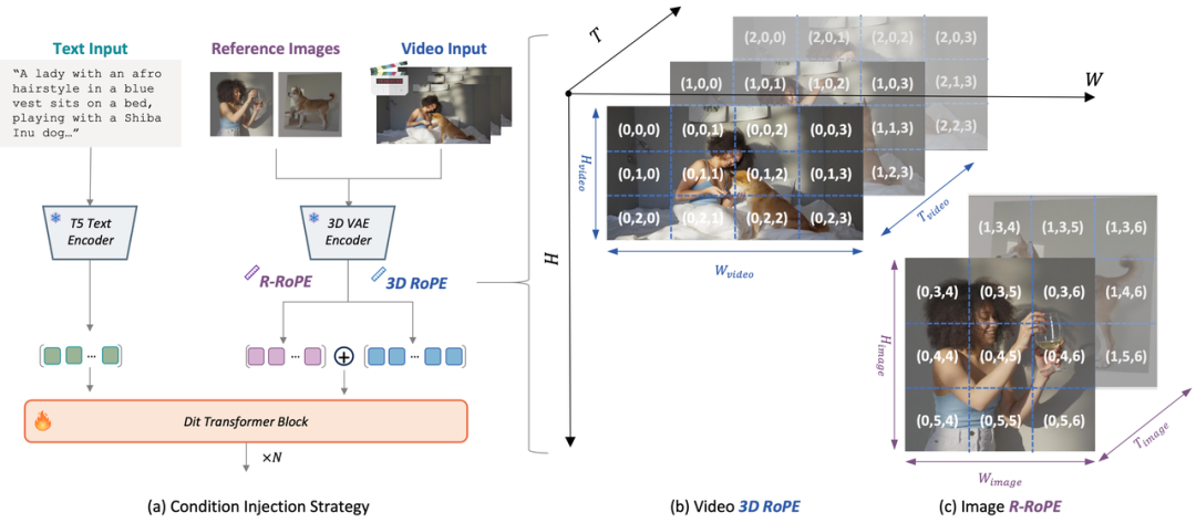 - Reference Rotary Positional Encoding(R-ROPE):为了在 DiT 架构中精确区分不同的参考图像与视频 Token,Kaleido 引入了 R-ROPE 机制。该机制对参考图像的 Token 进行独立的旋转位置编码,通过显式的空间位移,在注意力计算层面确立了不同主体与视频帧之间的清晰边界,有效解决了多主体特征混淆的问题。