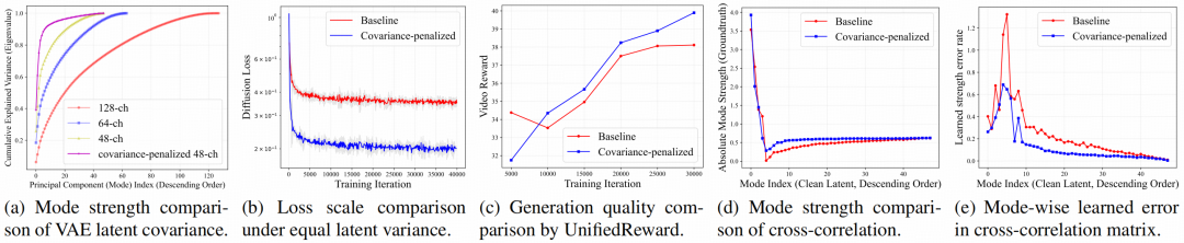 - 谱特性分析与正则化:我们通过大量实验发现,具有时空低频偏置(Low-Frequency Bias)和通道特征值的少模式偏置(Few-Mode Bias)的隐空间分布,能显著加速扩散模型的训练。