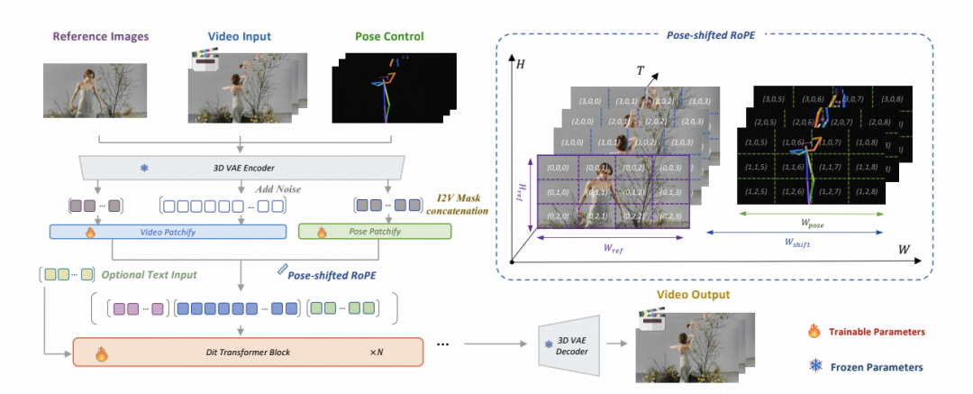 - 全上下文姿态注入(Full-Context Pose Injection):针对传统ControlNet或Adapter逐帧控制缺乏全局视野的问题,SCAIL在DiT架构中设计了全上下文注入机制,并在序列维度上通过Pose-Shifted RoPE(姿态偏移旋转位置编码)区分控制信号,迫使模型在生成每一帧时,不仅关注当前时刻,还能对整个动作序列进行时空推理(Spatio-temporal reasoning)。