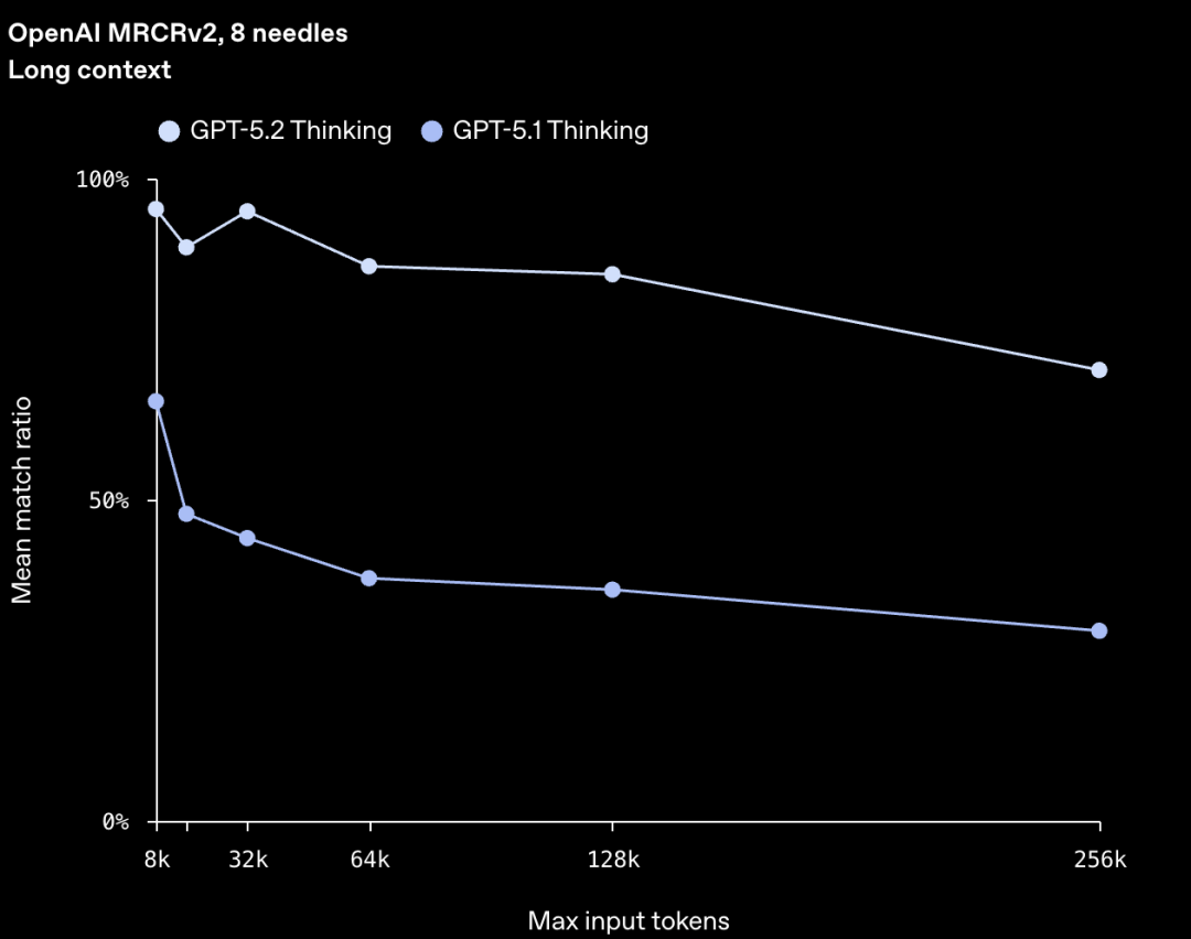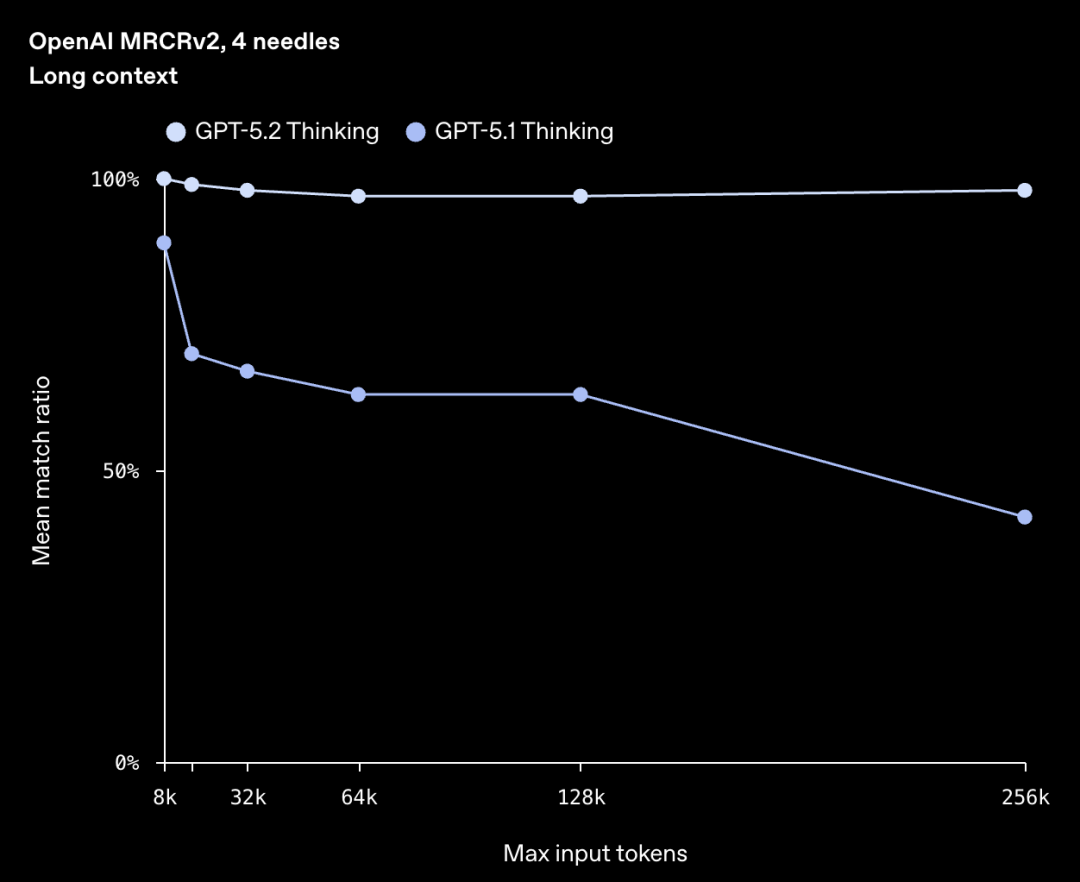 在OpenAI自制的大海捞针MRCRv2评测中,GPT-5.2 Thinking成为首个在256k 上下文长的4针版(4-needle variant)上达到接近100%准确率的模型。