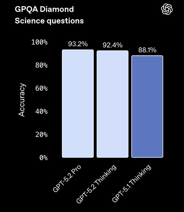 在GPQA Diamond研究生水平的问答评测上,GPT-5.2 Pro拿下93.2%,GPT-5.2 Thinking紧随其后达到92.4%。