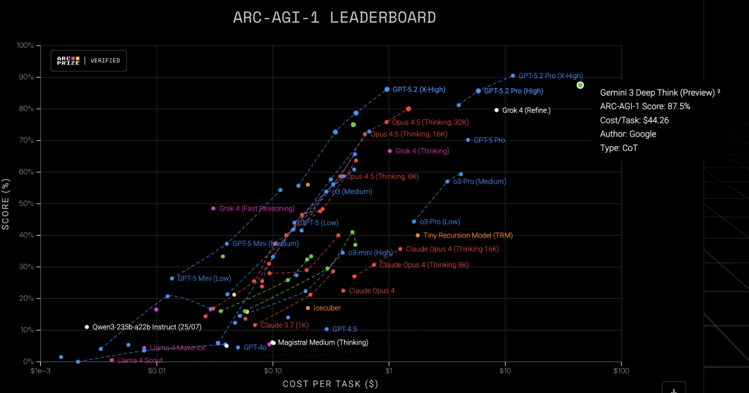 今天的GPT-5.2 Pro (X-High) ,最新SOTA得分为90.5%,平均任务成本仅为11.64美元,在一年内效率提高了约390倍。