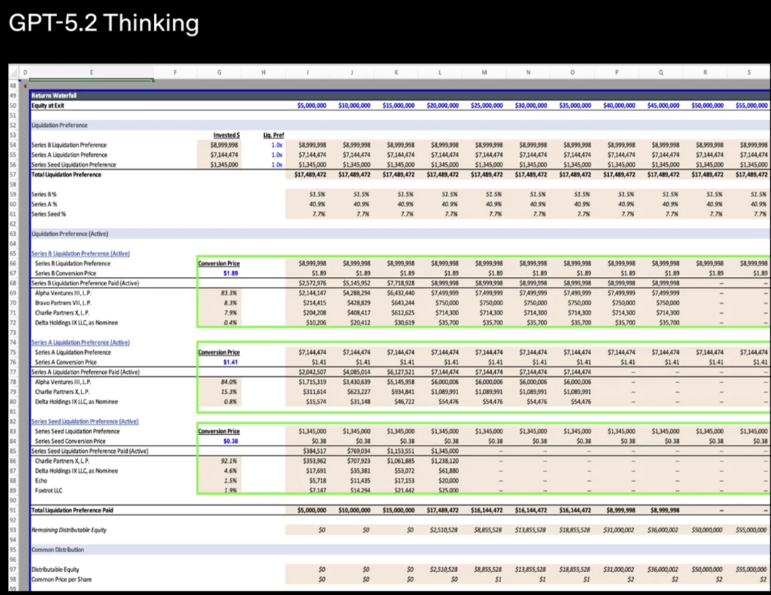 提示:您是一名投资银行分析师,刚刚接到一项任务,需要完成一份瀑布式分析,以了解创始人及现有投资者的所有权和回报情况。您的客户是一家正在考虑 C 轮融资的初创公司。