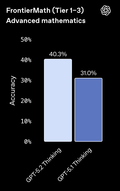 在专家级数学评测FrontierMath(Tier 1-3)上,GPT-5.2 Thinking以40.3%的解题率创下新纪录。