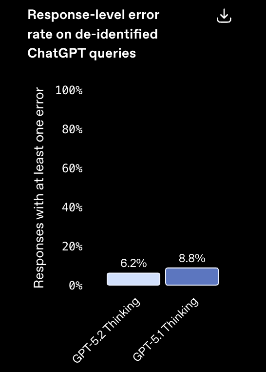 事实准确性方面,GPT-5.2 Thinking的幻觉问题相比GPT-5.1从8.8%减少到6.2%。