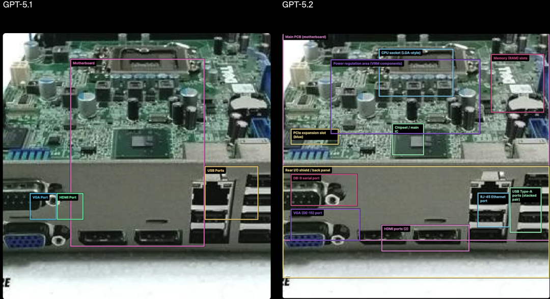 视觉理解能力也大幅提升,GPT-5.2能准确标记出更多主板上的元件。