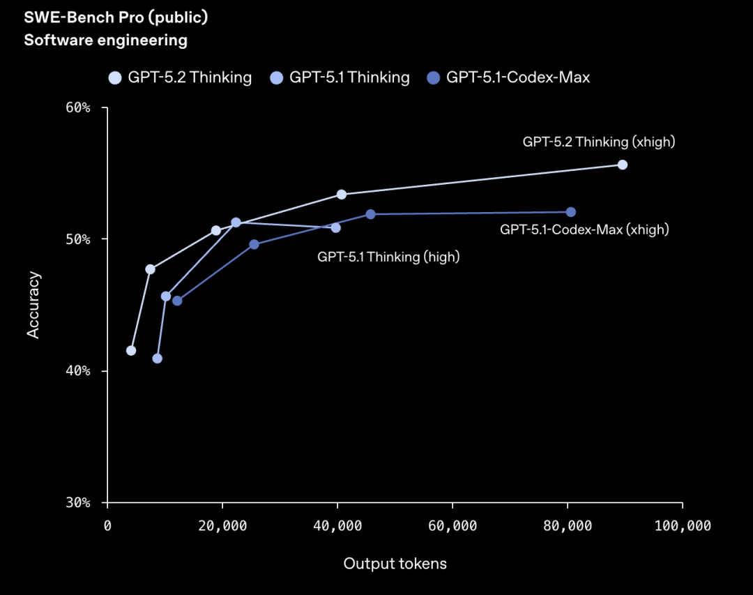 在SWE-Bench Pro这个更难的软件工程评测上,GPT-5.2 Thinking拿下55.6%的新高。