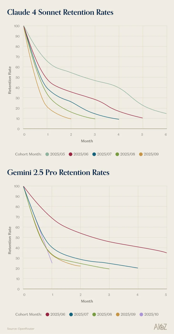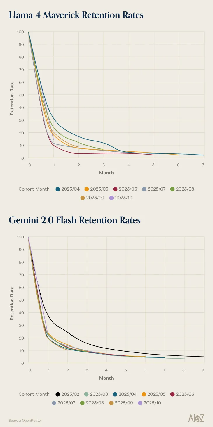 比如 Google 模型的早期版本 Gemini 2.0 Flash 和 Llama 4 Maverick。这些模型推出时都具备不错的能力,但相较于市场上的已有模型,并没有实现能力上质的提升。结果是,没有一个用户群组对它们产生持久的依赖。无论用户是在第 1 个月还是第 10 个月开始使用,他们都以大致相同的速度体验和流失。