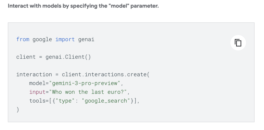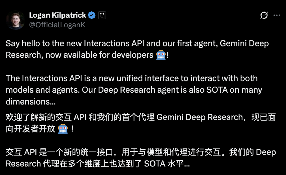 同时发布了Interactions API,为开发者提供了与Gemini 3 Pro和Deep Research智能体交互的统一接口。