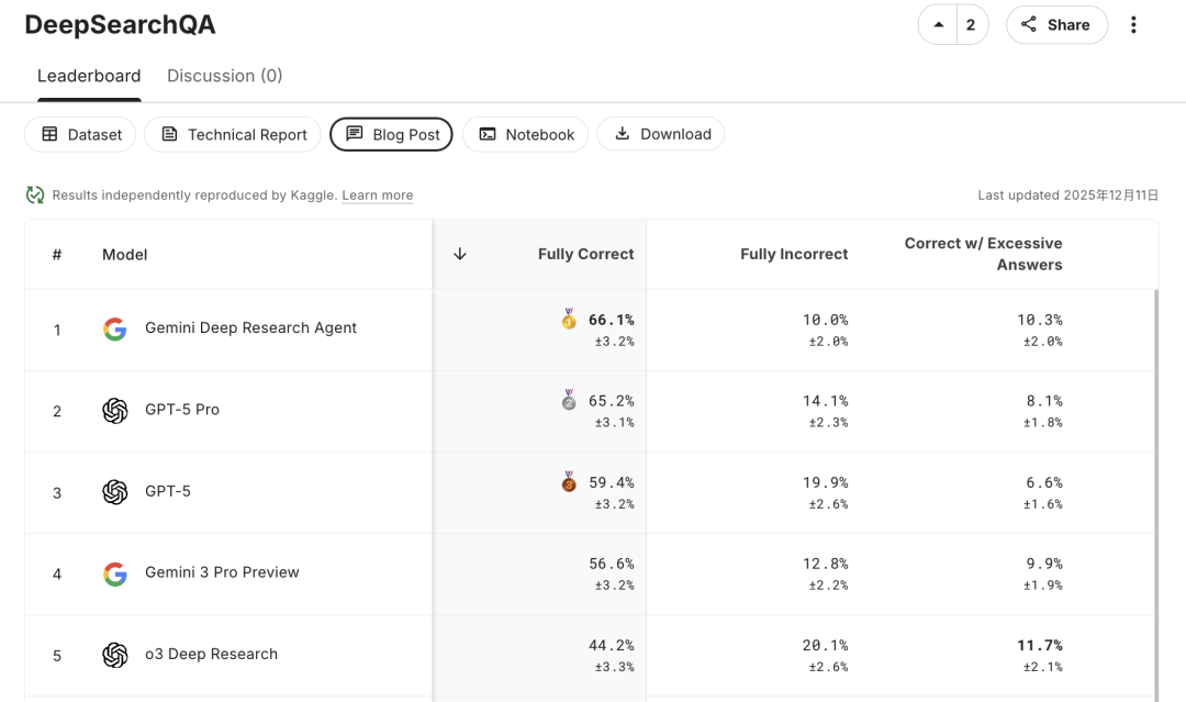 谷歌还配套推出了DeepSearchQA基准测试集,为深度搜索与研究任务提供了更全面的评估标准。