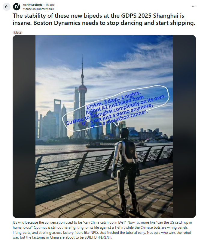 最近,一篇“中国机器人在比火场救人,美国机器狗还在给扎克伯格套脸?”的帖子被顶上了Reddit热门。