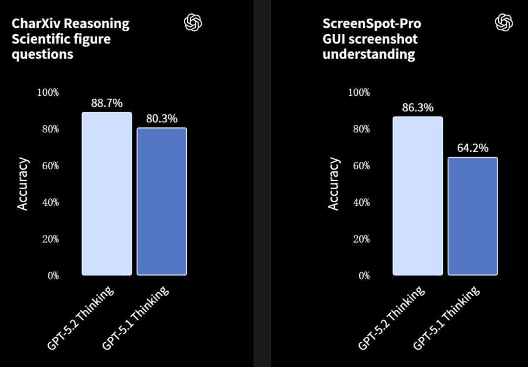 GPT‑5.2 Thinking是OpenAI目前最强的视觉模型,在图表推理和软件界面理解方面的错误率大约减少了一半。