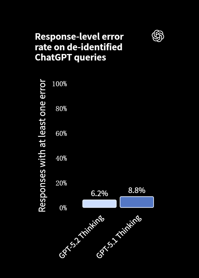 GPT‑5.2 Thinking比GPT‑5.1 Thinking的幻觉更少。