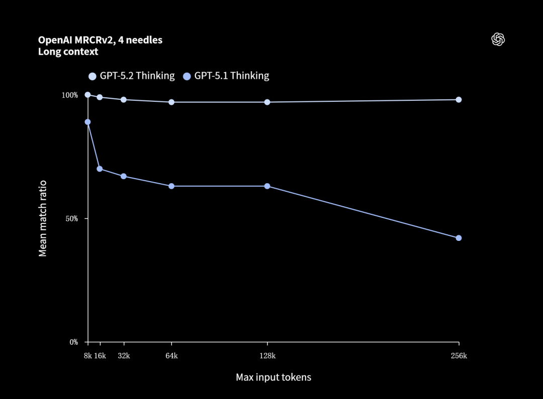 诸如深度文档分析之类的现实世界任务,需要跨越数十万个Token的相关信息,而在这类任务上,GPT‑5.2 Thinking 比GPT‑5.1 Thinking准确得多。