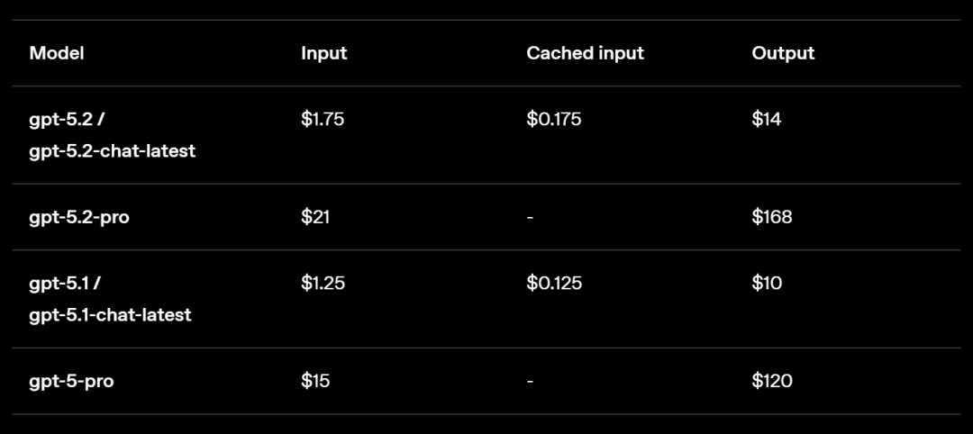 GPT‑5.2的定价为1.75美元/百万输入Token,14美元/百万输出Token,缓存输入有90%的折扣。