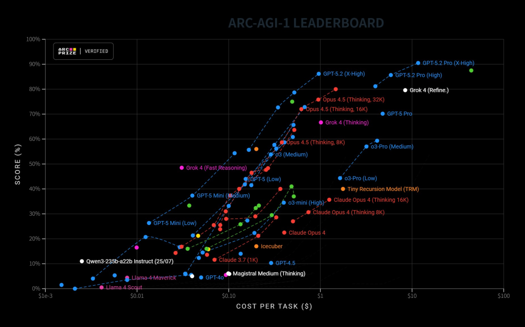 在衡量通用推理能力的基准测试ARC-AGI-1(Verified)上,GPT‑5.2 Pro是第一个跨越90%门槛的模型。