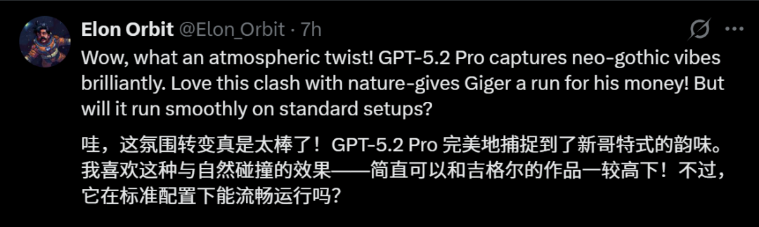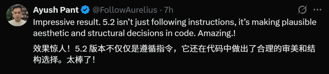 对于这个视频,很多网友大加赞叹:GPT-5.2不仅遵循了指令,还在代码中选择了非常合理的审美和结构。