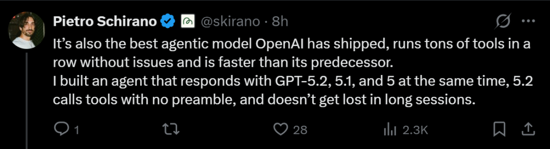 这位CEO对于GPT-5.2的评价是:它是OpenAI推出的最佳智能体模型,可以连续运行大量工具而不会出现问题,并且比其前代产品速度更快。