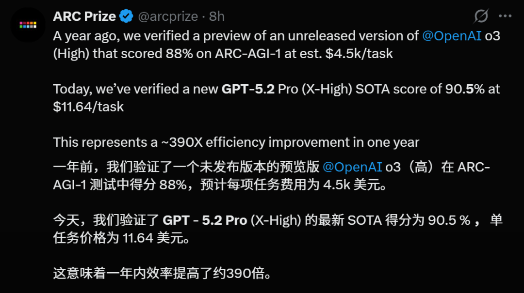 ARC Prize表示,GPT-5.2 Pro(X-High)的最新SOTA得分为90.5%,这就意味着,AI在一年内效率已经提高了约390倍。
