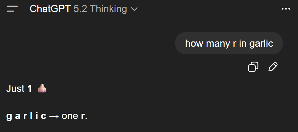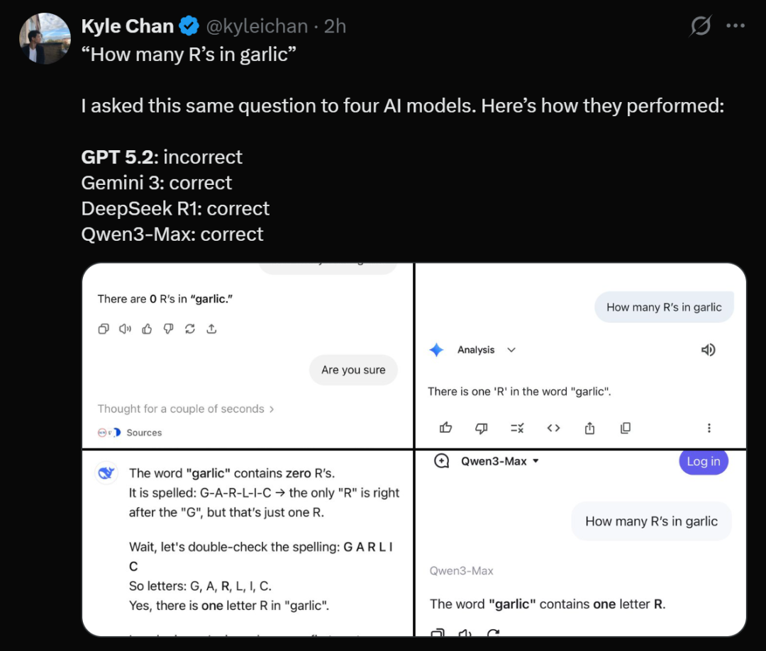 如果向它提问:「garlic」中有多少个R?它会回答:0个。