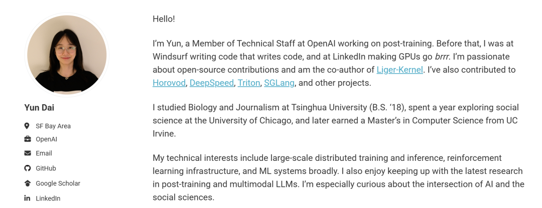 负责后训练的Yun Dai,本科来自清华大学,在加州大学尔湾分校获得了计算机科学硕士学位。