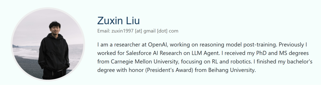 另一位OpenAI华人研究员Zuxin Liu,从事推理模型后训练工作。