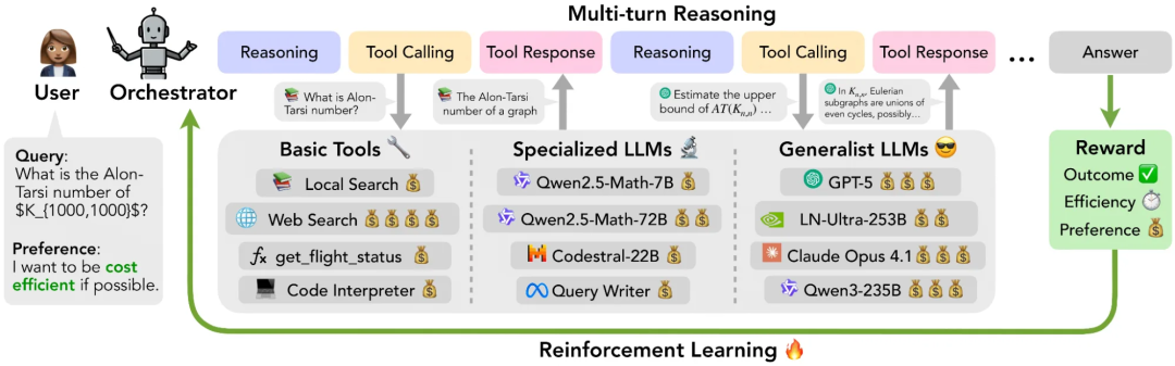 英伟达研究团队的新模型Orchestrator仅有 80 亿参数(8B)的模型,不仅比以往的工具使用类AI智能体准确率更高、成本更低,还能在工具选择上精准对齐用户的偏好。