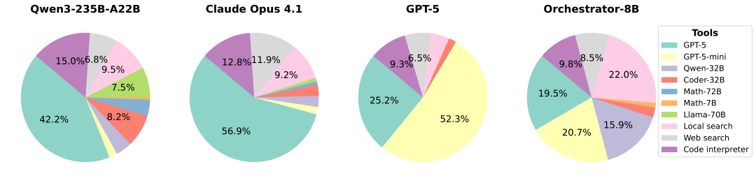 Orchestrator会按需调用本地检索、Math-7B、Qwen-32B等低成本工具,仅在关键步调用GPT-5(1.95次/题);