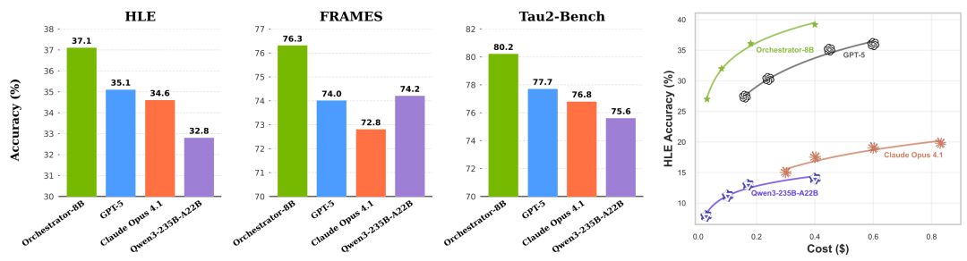 在HLE基准测试中,Orchestrator斩获了37.1%的高分,一举超越了GPT-5(35.1%),同时在效率上提升了2.5倍。