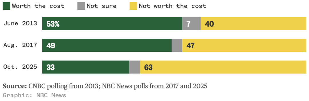 到了2025年,认为上大学值得的比例降至33%,在12年间整体降低了20%。
