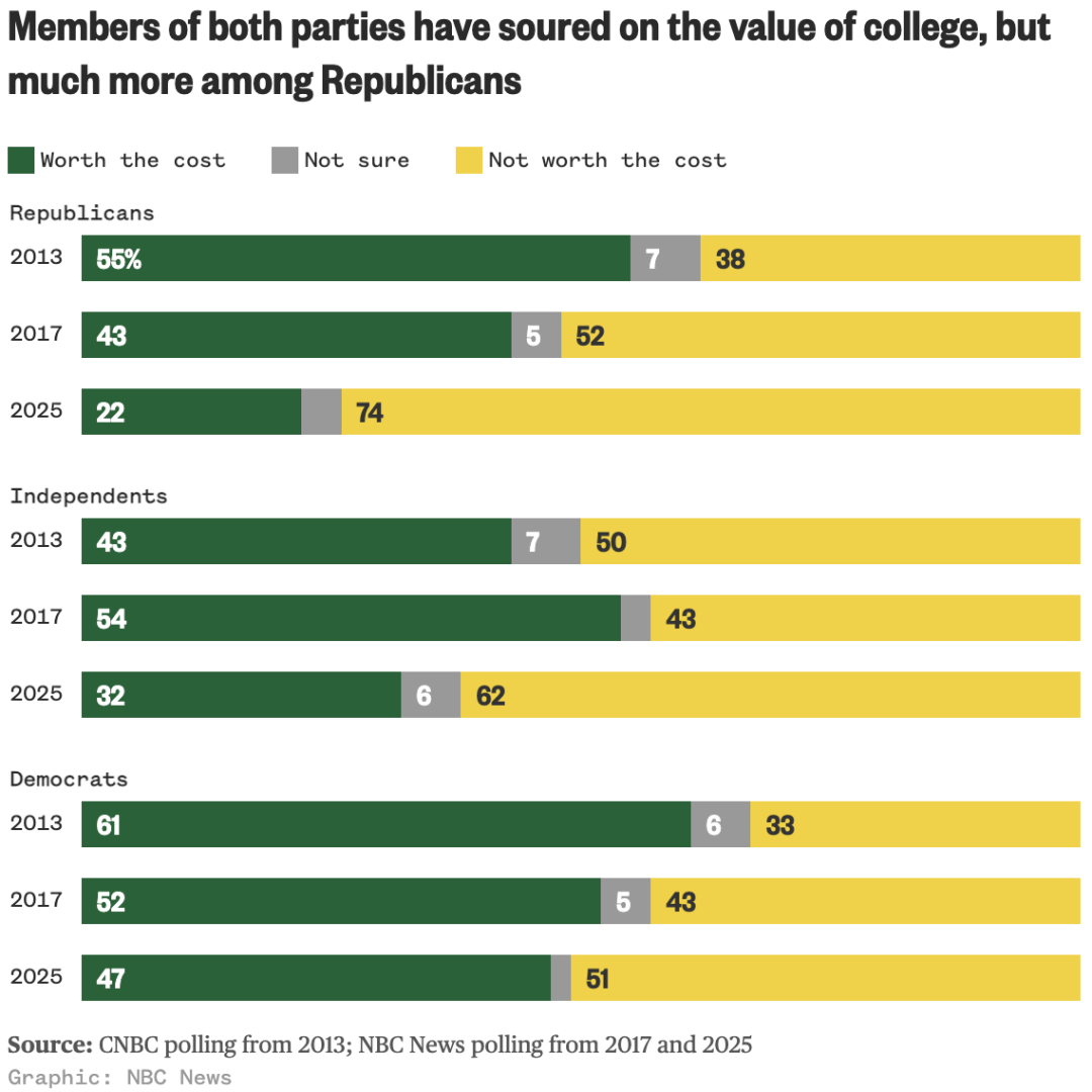 2013 年,55%的共和党人认为大学值得,38%认为不值得;而现在只有22%认为值得,74%认为不值得。