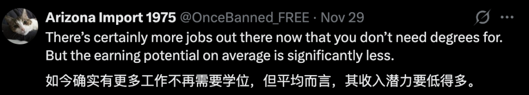 还有网友贴出了2023年《华尔街日报》的民调结果,约56%的被调查者认为四年制大学学位不值其费用。