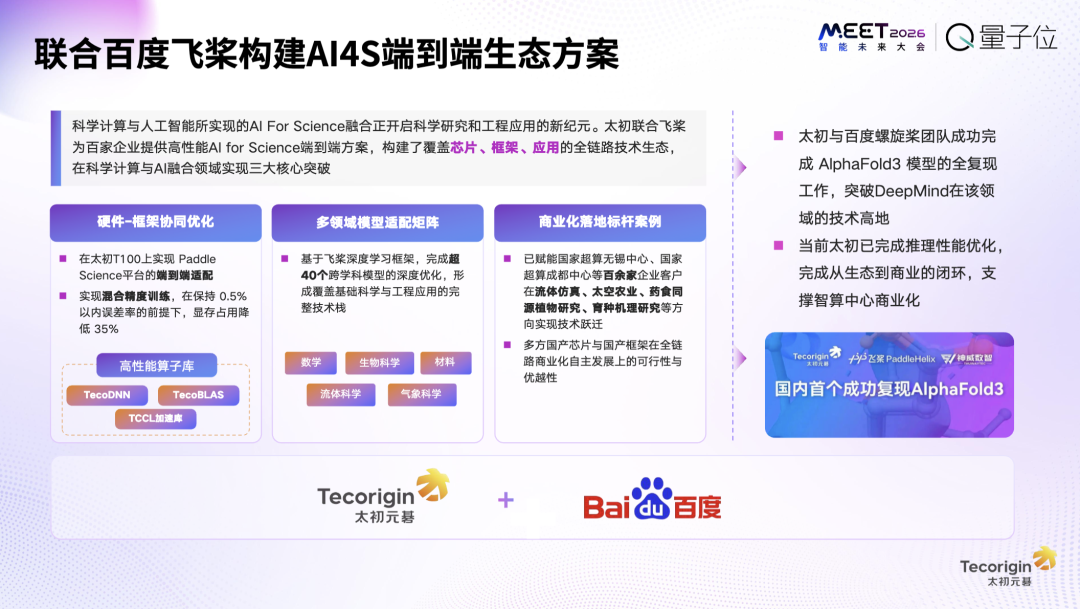 我们深度参与了百度飞桨社群的建设,太初元碁跟百度的团队也开展了很多合作,去年,我们一起完成了AlphaFold3蛋白预测模型的国产平台复现。
